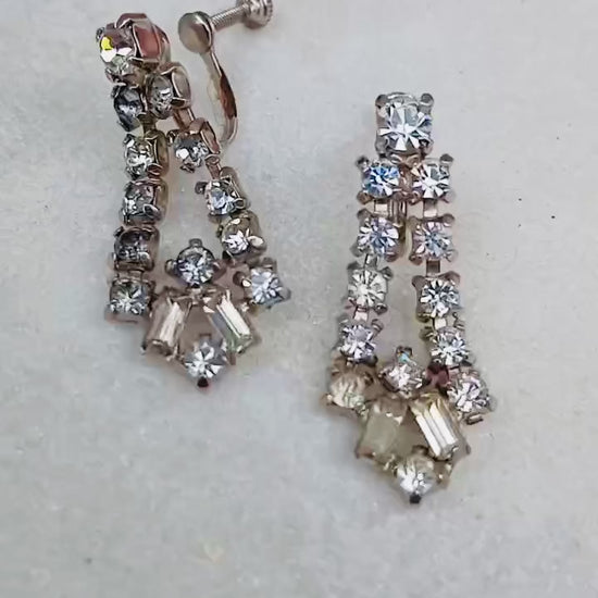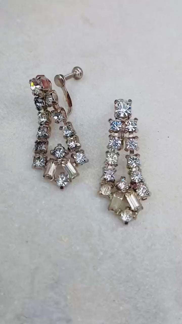 Vintage glamour radiates from these exquisite 1930's rhinestone earrings. These earrings feature a cascading design, with sparkling clear rhinestones set in a silver-tone metal. The arrangement of the stones creates a beautiful, eye-catching effect, perfect for adding a touch of vintage charm to any outfit. These earrings are approx. 1 1/4" long, screw backs, have been worn before, and are in good vintage condition.
