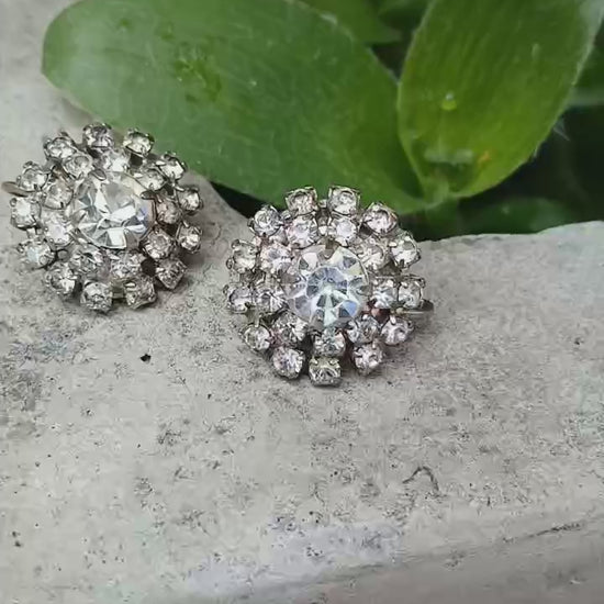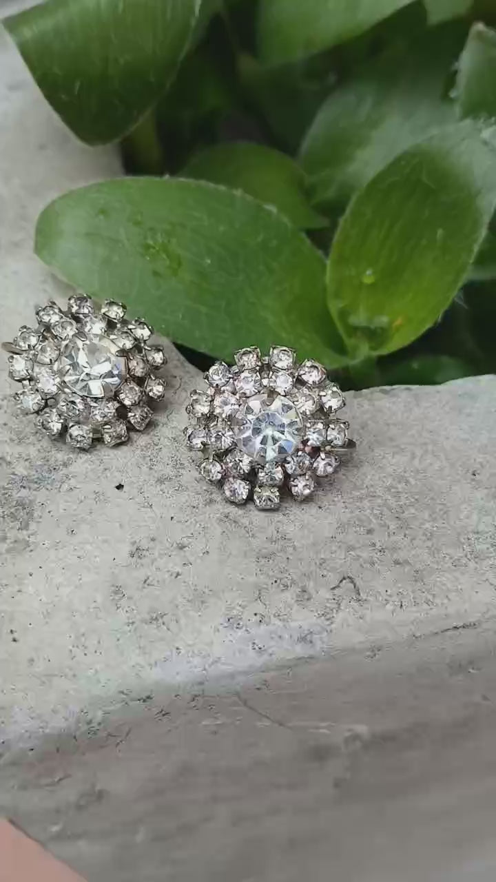 Add a touch of vintage glamour to your jewelry collection with this stunning pair of vintage rhinestone starburst earrings. These approx 3/4" diameter earrings feature a classic floral or starburst design, encrusted with sparkling clear rhinestones. The central, larger rhinestone is surrounded by a halo of smaller stones, creating a dazzling, eye-catching effect. Set in a silver-tone metal, these clip-on earrings exude mid-century charm, reminiscent of 1940s and 1950s glamour.