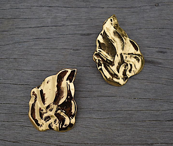 Two vintage 1980's gold gilt modernist YSL brooches. Hammered with a slightly textured finish and shaped in an abstract form of a leaf or a flame. "Made in France YSL" is engraved clearly on the back side of the brooches. Very beautiful designer vintage pieces created by the legendary Robert Goossens for YSL. Closure on both brooches are nice and tight. Approx. 1 1/8" width x 1 5/8" length.