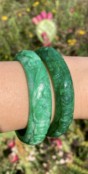 Two 1970's-80's vintage carved and dyed jade bangles. Measuring 7" in diameter, and 10 mm wide, these beautiful, hand carved, jade bracelets were designed to slip over the wrist with no opening. Hand crafted from dyed jade, these dreamy bracelets showcase a blend of traditional craftsmanship and unique coloration. These bracelets are vintage, and show minimal signs of wear.