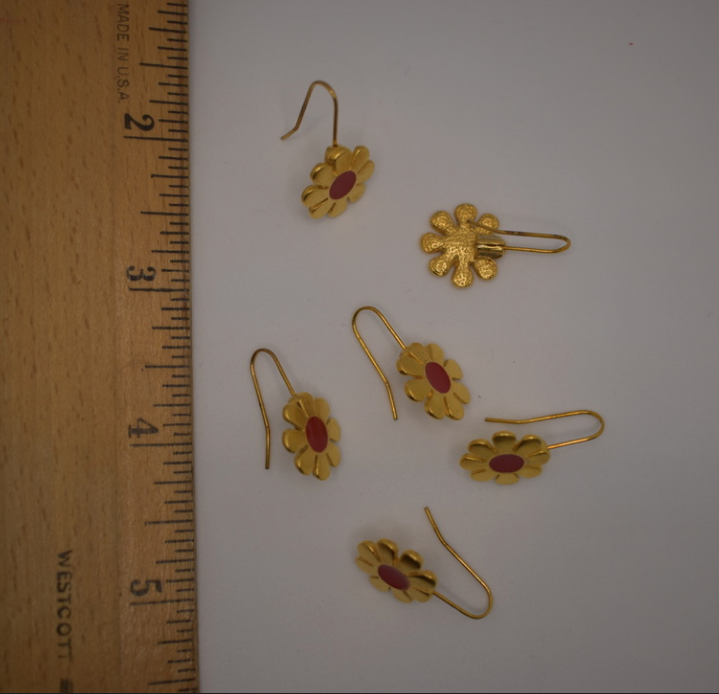 Two pairs of new vintage, 1960's-1970's gold plated over brass, flower dangle earrings. Made in the shape of a daisy, these fun earrings have an enameled red center. These sweet earrings have never been worn and are in pristine condition. Approx. 1" length x .5" width.
