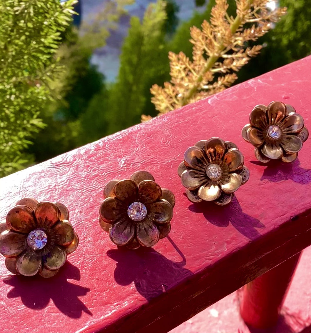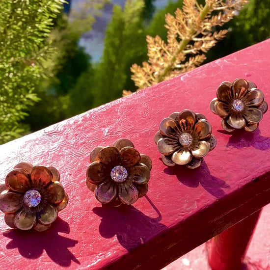 Two pairs of vintage 1930's clip-on, gold plated over silver flower earrings with rhinestone center. These exquisite vintage earrings feature a delicate floral design with a textured gold-plated finish over a silver base, giving them a warm and radiant glow. Each earring is adorned with a sparkling paste stone at the center, adding a touch of vintage glamour. Measuring slightly over 1/2" in diameter, these gorgeous earrings showcase a slight, natural patina, which enhances their vintage beauty and tells a story of their past. This subtle aging adds depth and character to the earrings, making them a unique and authentic find. Perfect for adding a touch of elegance to any outfit, these earrings are ideal for vintage jewelry enthusiasts or anyone looking for a special statement piece.
