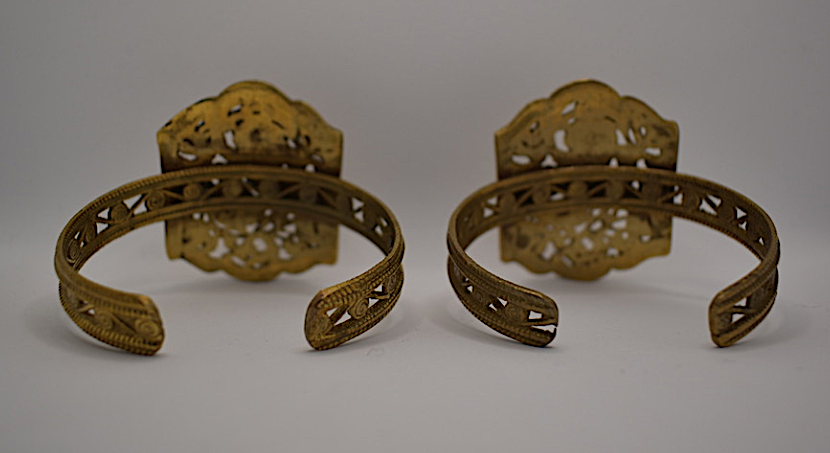 Two turn of century gold gilt bracelet cuffs. Typical for early 20th century Aesthetic and Art Nouveau fashion, this gorgeous set of cuffs depicts romantic lions climbing through twisting vines on a large 1 1/2" wide x 1 7/8" L rectangular medallion. The gold gilt over brass is in good condition with only minor signs of wear remarkable for the bracelets' age.